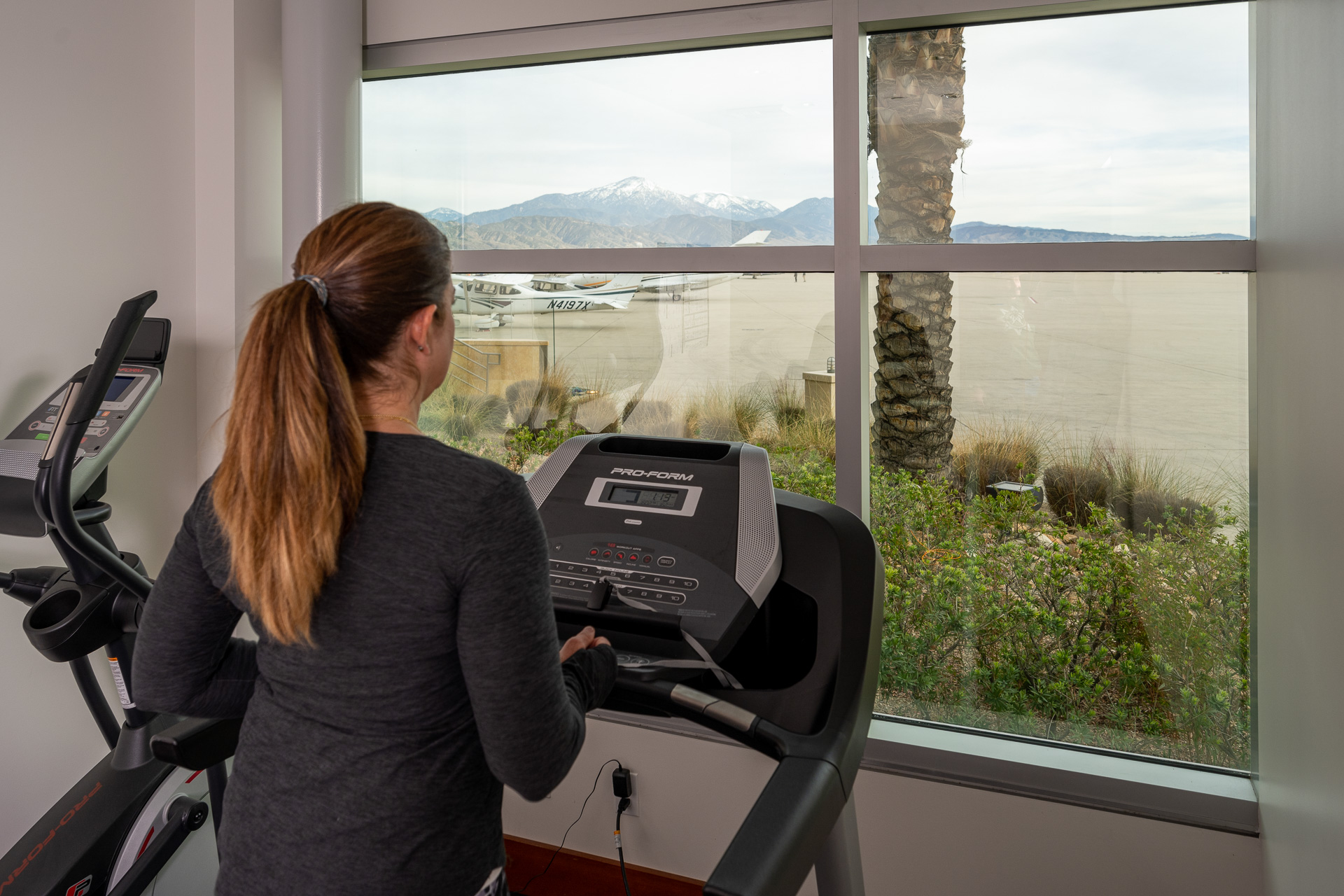 Our modern fitness room features the latest equipment, allowing you to maintain your workout routine even when you’re miles from home. As you exercise, enjoy panoramic views of the bustling airfield, watching aircraft take off and land.